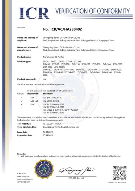 Chongqing Rexon Oil Purification Co., Ltd. Contrôle de qualité