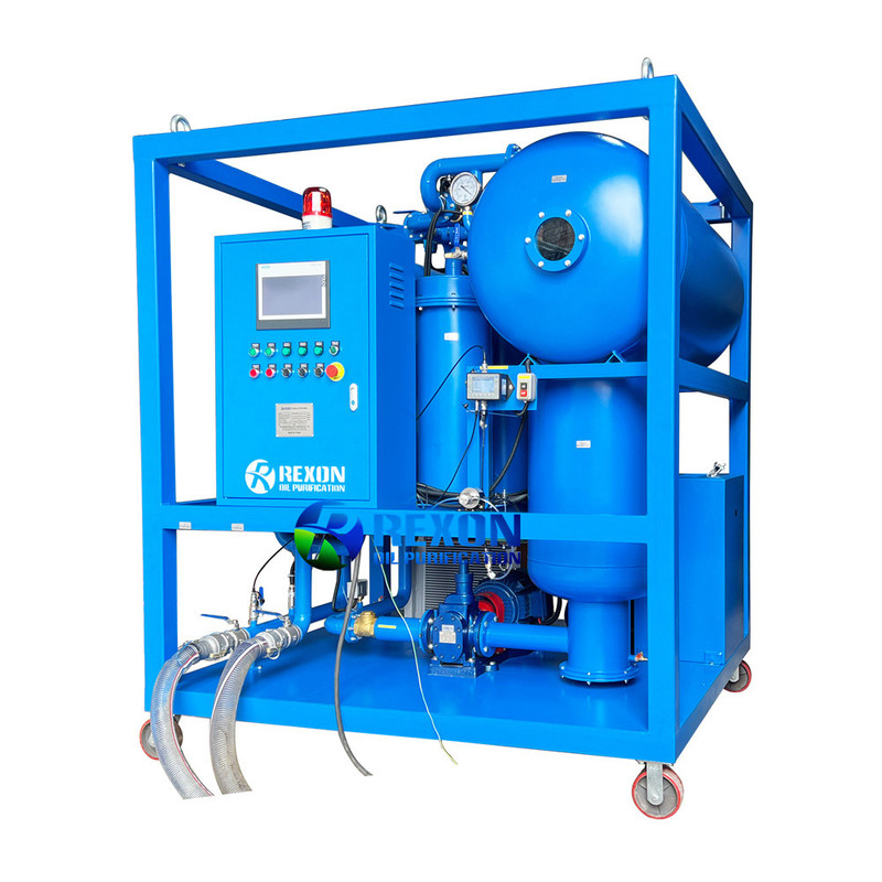 Purificateur d'huile de turbine à haute pression REXON TY-200 est une machine de traitement d'huile à turbine de grande capacité, avec débit12000 litres/heure,Il permet d'éliminer rapidement et efficacement l'eau, le gaz et les impuretés de l'huile de turbine, de la démulsifier et de la déshydrater rapidement.émulsification facile et teneur élevée en impuretés pour que l'huile retrouve sa nature nouvelle. The automatic oil purifier model is installed with PLC (Programmable logical control system) which can control the equipment automatically to every stage of its process and ensure its process and ensure its safe operation on site and on line without human supervision.